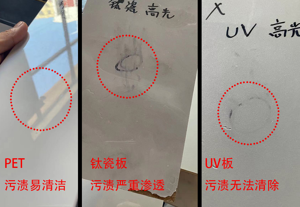 这三种板子大部分都是为了做高光亮面效果,也有哑光肤感的,钛瓷板和钛和瓷一点关系都没有,他的材料也是UV漆,和云石板一样都是不良商家为了蛊惑客户起的一个名称,都属低端UV板。UV是一层很薄的漆面,UV门板的基材是含胶量极大的密度板,也就是人们常说的毒板,这种材料不适用于家装,会持续释放甲醛、苯等致癌物质;而PET是一种材料,一种高分子膜。真正的PET门板的基材是MDI环保颗粒板。UV门板在外观上很难和PET区别,可以通过钥匙等尖锐的东西对表面进行划痕测验,PET很难留下划痕,而UV门板优于硬度不够很容易留下划痕。也可用记号笔测试UV门板和PET的区别,前者用记号笔画上痕迹很难擦除甚至会渗透到漆面内,而PET很容易就擦掉。在日常使用中,因为PET材料具有明显的不褪色、不变色、耐压、耐碰、耐高温、抗腐蚀、耐老化,易清洁等优点。随着时间推移UV门板会慢慢发黄、发脆,而PET则不会。从侧面来看PET的厚度在0.5mm左右,而UV的厚度仅0.1mm左右,使用过程中容易崩边起皮。